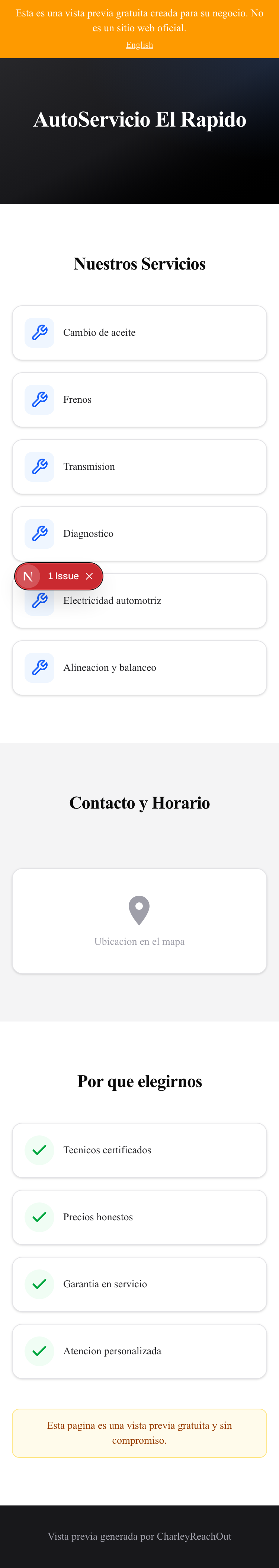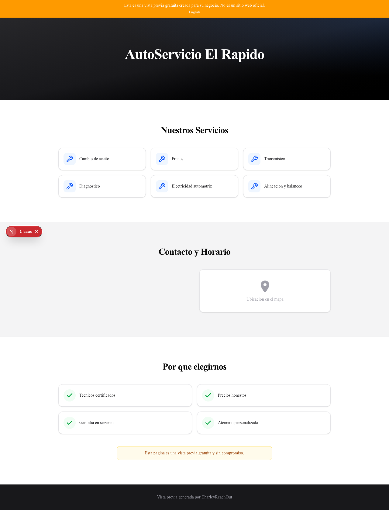 Hola AutoServicio El Rapido, vi que tu taller no parece tener sitio web, así que te preparé una página de muestra gratis y te adjunto una imagen. También ofrezco una app sencilla para talleres con clientes, historial de servicio, facturas, calendario, partes y más. Puedes verla en charleyservice.com. Si te interesa una llamada rápida de 10 minutos, escríbeme a jsbono@gmail.com. Responde STOP para dejar de recibir mensajes.